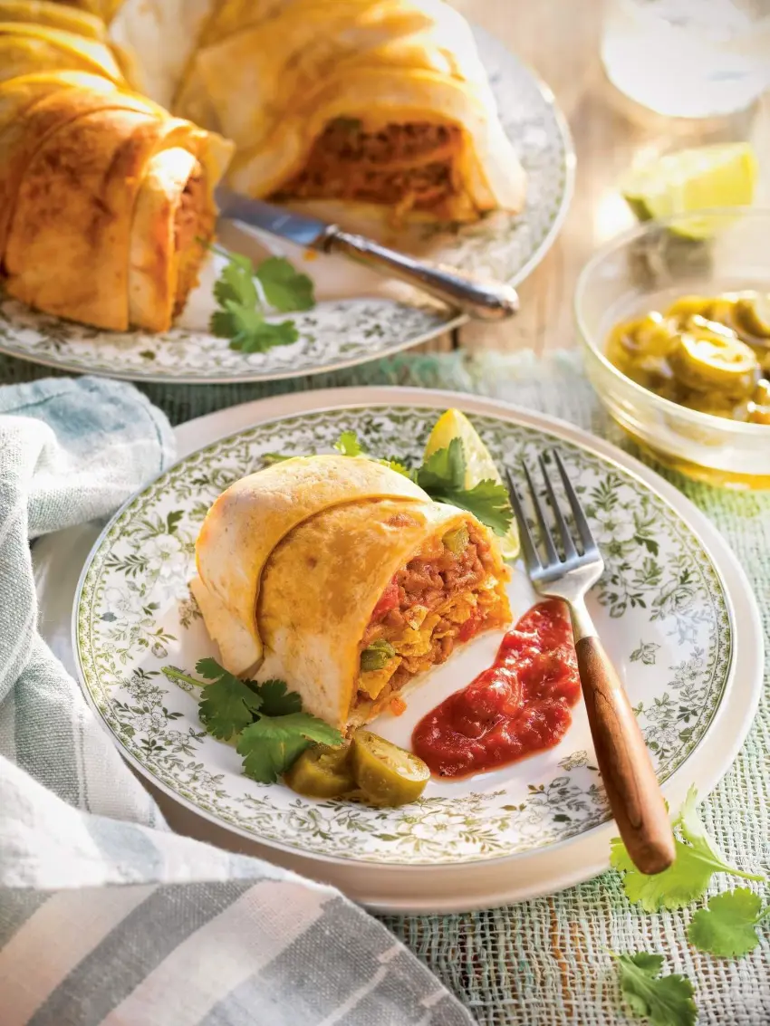 - Sirve la corona de tortilla caliente. Acompáñala con la salsa de tomate preparada en el paso 3 y decora con rodajas de jalapeños frescos o encurtidos.